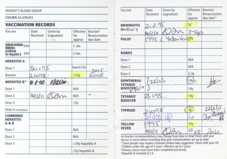 doctor / Travel Clinic to get a full set of jabs. The staff at your local surgery/clinic will tell you definitively what you need to have, based on the countries you are visiting and to some extent where you are staying, e.g. city/rural etc. there is an overview with more information here. I'd advise you to make your surgery/clinic appointment(s) in the afternoon or evening, as it's not uncommon to feel a bit rough after a vaccination, hardly surprising since the term 'vaccine' effectively means that a low-level derivative of the parasite / virus is injected into your body to stimulate your own immune system - the hard way. The injection(s) themselves are given in the shoulder and if you are receiving multiple jabs in a single sitting, both shoulders are used. Some vaccines are administered just below skin level (subcutaneously) and are pretty-much painless; others go deeper into the muscle and will sting a little - but it's nothing you can't handle. Make sure you get a vaccinations record card (below) when you start your series of vaccinations, the card shows which jabs you've had and their longevity, keep hold of the record card to avoid having to get repeat jabs unnecessarily when prepping for future trips - it's very easy to lose track of what you've had.